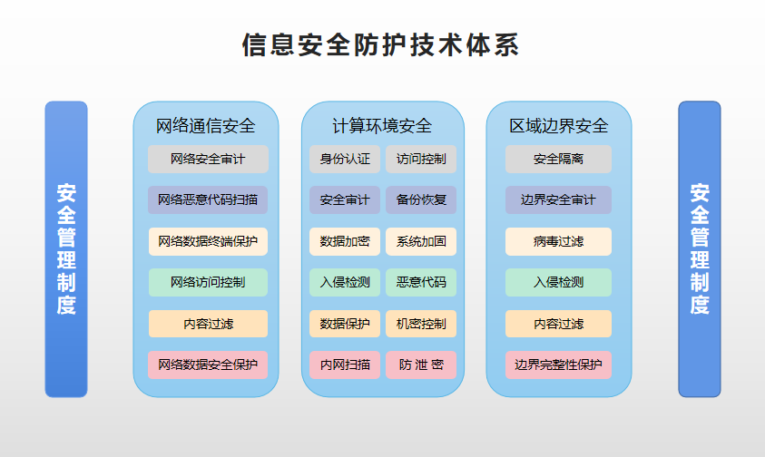 信息系統(tǒng)的安全建設(shè)包括三方面:一是技術(shù)安全體系建設(shè);二是管理安全體系建設(shè);三是運行保障安全體系建設(shè)。其中,技術(shù)安全體系設(shè)計和建設(shè)是關(guān)鍵和重點。 信息安全防護技術(shù)整體解決方案